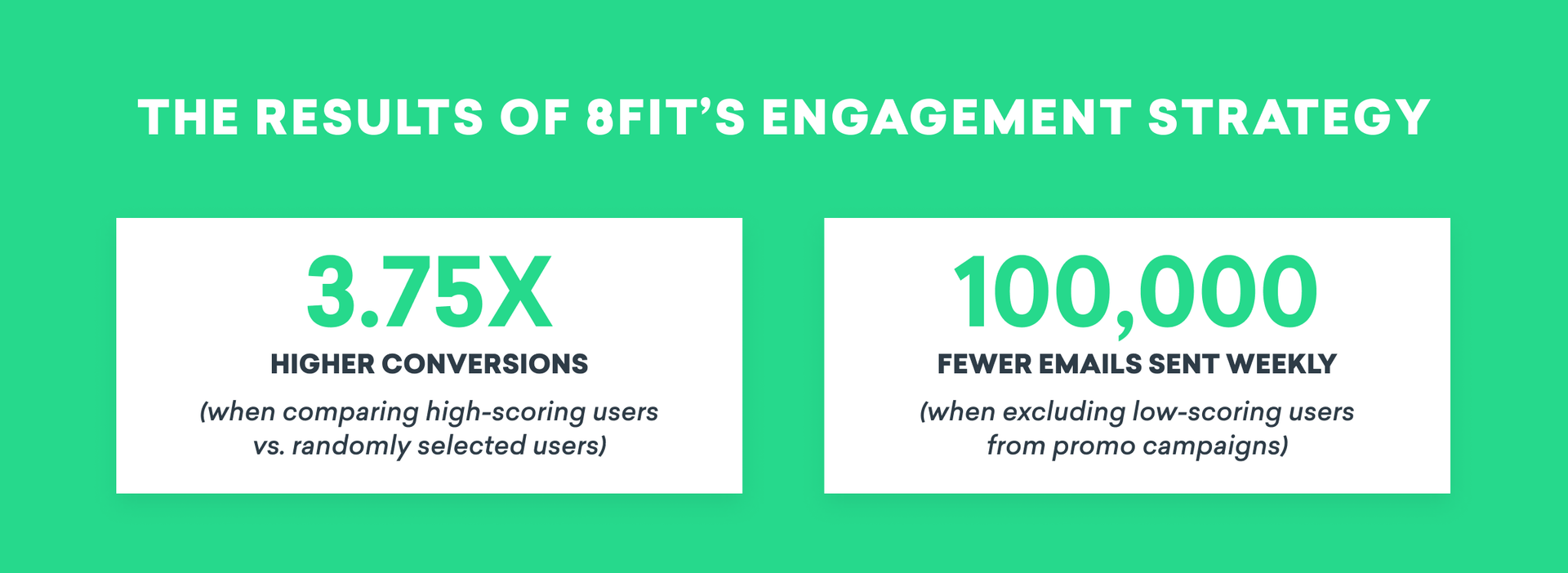 In one A/B test, 8fit saw that conversions for users with high probability to purchase were 3.75X higher than a randomly selected cohort of the same size. In another multivariate test, 8fit increased the relevancy and efficiency of their campaigns by excluding low-scoring users, which saved sending 100,000 emails weekly with no negative impact on conversions.