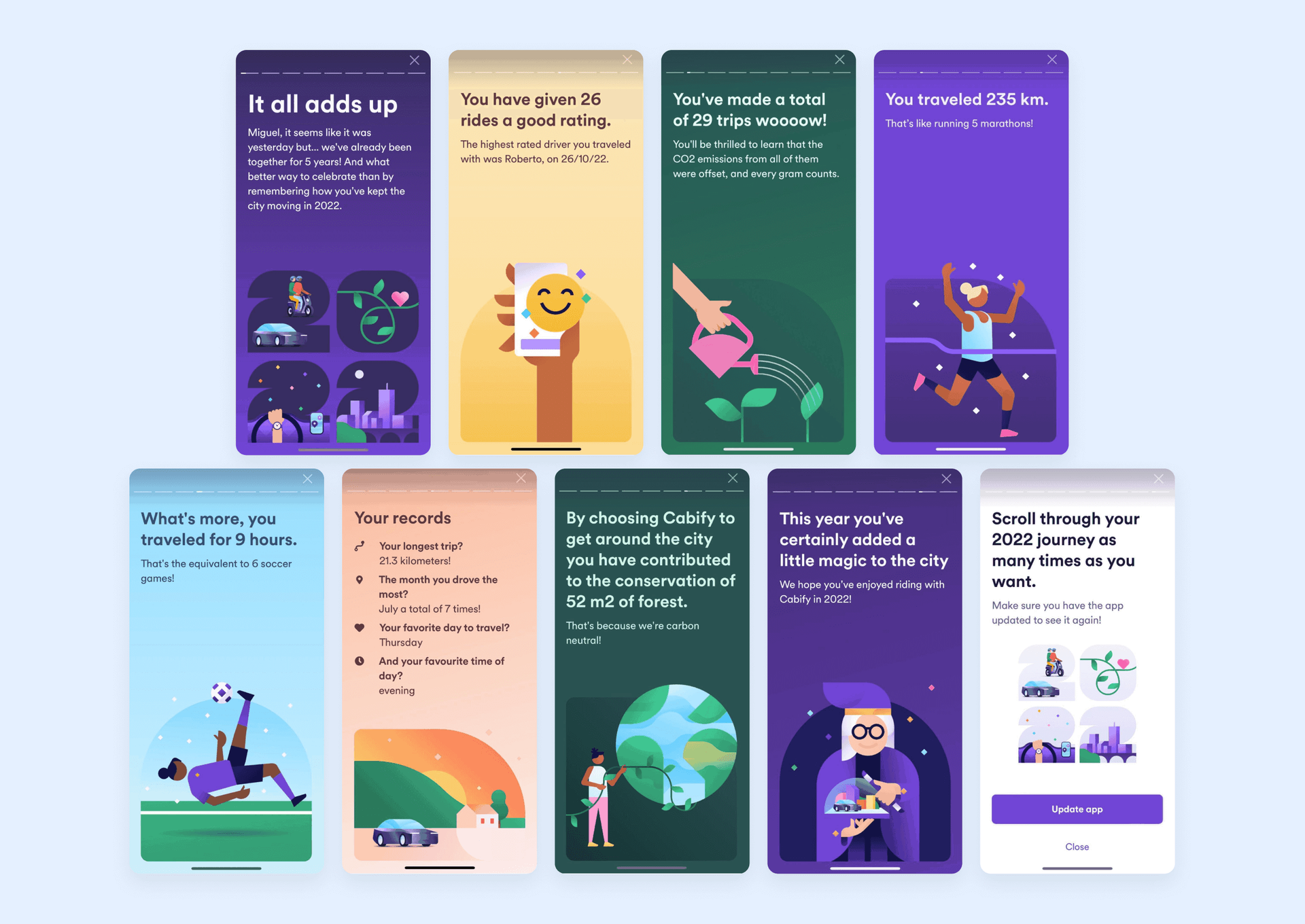 The nine slides featured personally relevant stats and their corresponding equivalents, like how the time they traveled with Cabify was the equivalent of six soccer games. The slides also celebrated ways their Cabify trips have helped improve the city they called home, like CO2 emission offsets and forest conservation.