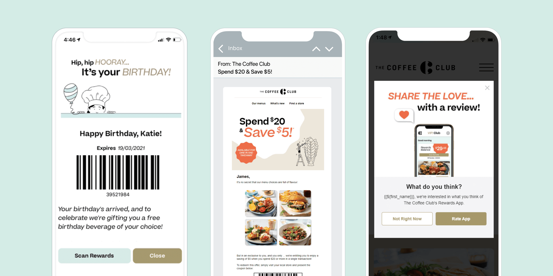 In evaluating its effort to pivot to a more robust digital strategy, The Coffee Club identified two key areas on which it wanted to focus its messaging: Driving sales directly from communications via barcoded in-app and email-based coupons that are seamlessly integrated into their point-of-sale system, and increasing app reviews of its newly developed in-house app. The two objectives worked together to grow both the audience and sales from the loyalty program.