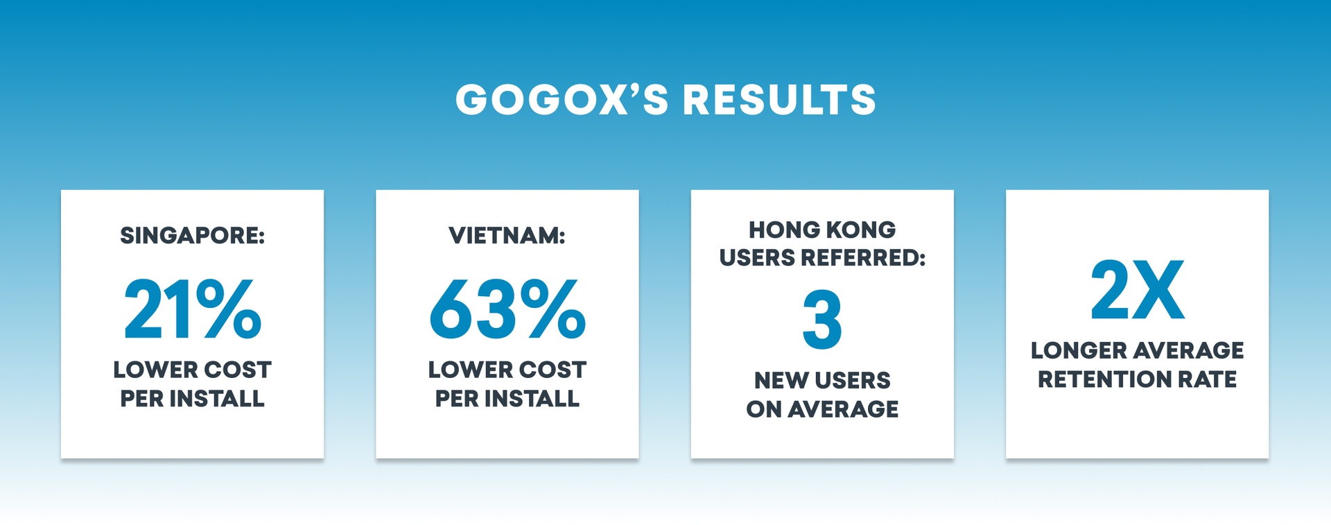 In Singapore, CPI was reduced by 21%, while Vietnam saw a dramatic 63% reduction in CPI. What’s more, referrals doubled their average retention rate, meaning that not only was the campaign attracting new users, but that these new users were high-quality and more likely to stick around and contribute positively to the bottom line. In Hong Kong, where the goal was not installs, each referrer successfully recommended three new users on average.