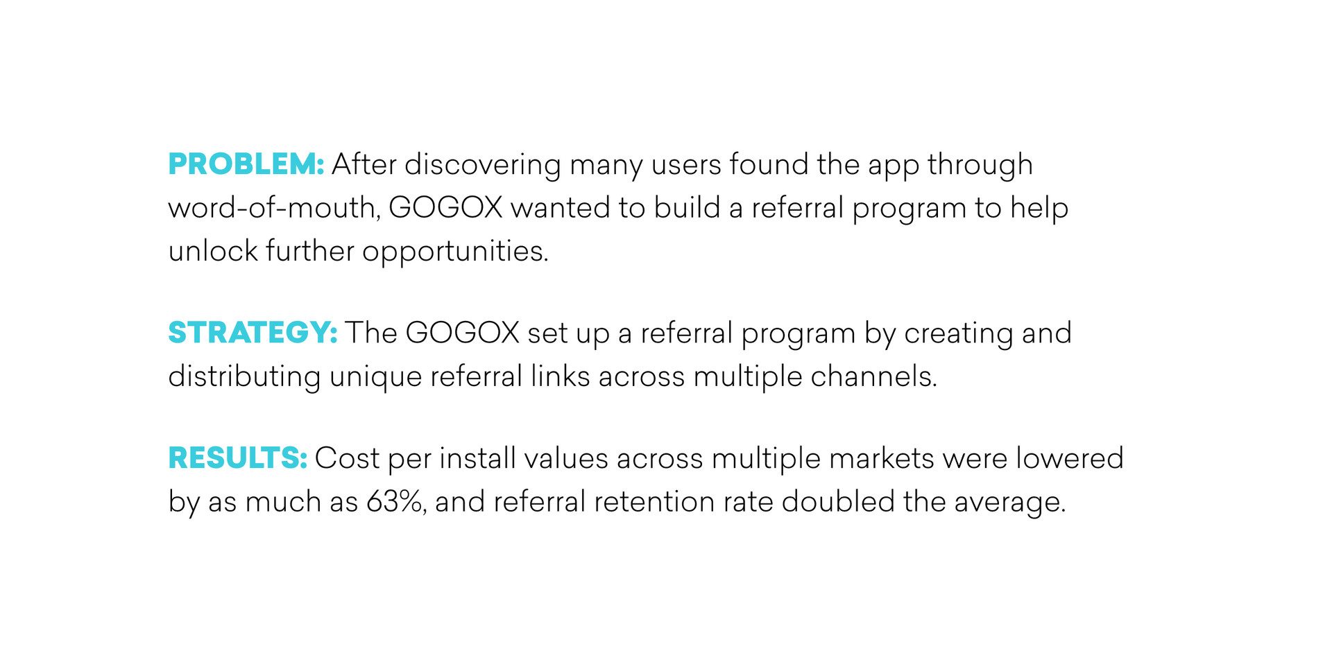 With Braze and AppsFlyer, GOGOX was able to roll out a dynamic, cross-channel, measurable referral campaign without the kind of custom development that would decrease efficiency. The company calculated the amount it cost to acquire a new user compared through a KPI they called Cost Per Install (CPI), and saw a significant difference in the CPI of their referral program compared to paid marketing.