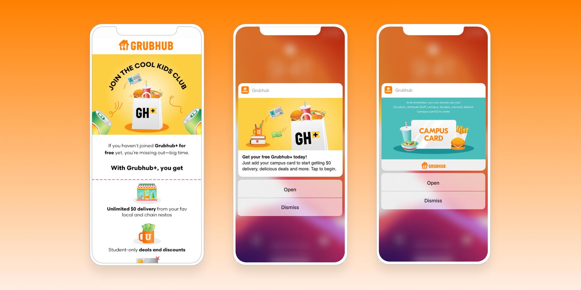 Because Grubhub Campus, part of Grubhub’s B2B program, is a unique offering and unfamiliar to many students when they arrive at school, showcasing the value it provides (including exclusive promotional codes and a free Grubhub+ subscription that provides no-cost deliveries on eligible orders) is key to driving significant adoption. Prior to the implementation of Braze, Grubhub faced a significant challenge: Student enrollment rates in the Grubhub Campus program were persistently low, with many students beginning—but failing to complete—the related onboarding process.