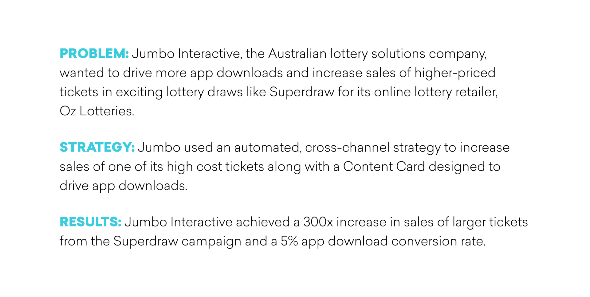 “We saw the success of using Content Cards as a native, on-site touchpoint for actions such as downloading the app,” says Melissa Cowan, Marketing Automation Specialist at Jumbo Interactive. “But the real success came when we used the Content Cards in the app environment. We’re reaching players with personalised messages as they’re engaged in the app, without interrupting their purchase flow.”