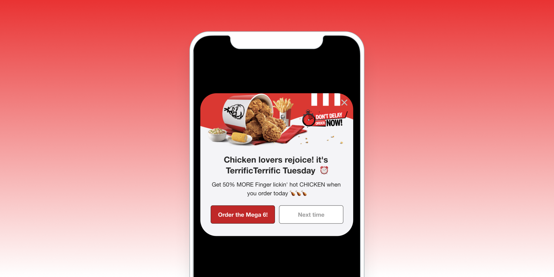 The new and improved “Terrific Tuesday '' engages users across email, IAM, and push notifications with an amazing discount offer each Tuesday—50% more chicken for the same price if they order in the app (applicable to certain combos only.) Using Braze Intelligent Channel, the promotion is sent via the channel users are more likely to engage with. They target all iOS and Android app users who have not redeemed the offer within the last two weeks.Additionally, they revamped a separate “Terrific Tuesday” campaign, and alternated between the two. With these automated, evergreen campaigns, KFC Trinidad and Tobago can engage users with personalized content without additional time or effort.