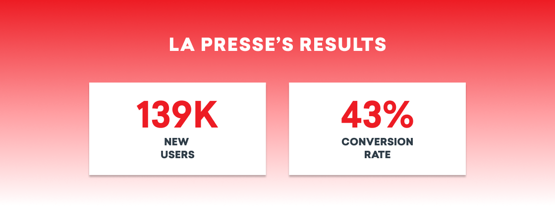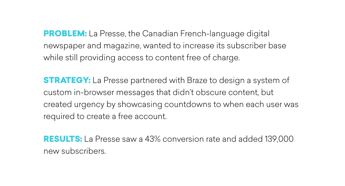 Every use case is different when it comes to effective digital messaging—and often, there are multiple goals for each campaign. For La Presse, making content easily accessible and winning new subscribers are equally important. That’s why subscription solicitations delivered with customized ad content needed to be as effective as possible without harming the user experience. With a little extra work on HTML and CSS, La Presse was able to use Braze to deliver the exact messaging strategy needed to achieve these objectives.