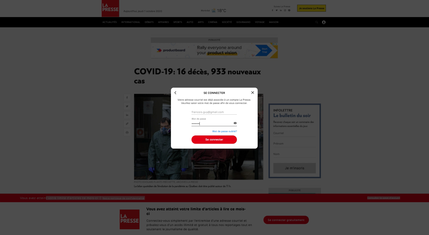 While La Presse doesn’t collect payment from readers or put its content behind paywalls, the publication still wants them to create accounts so their use of content can be measured. La Presse’s solution was to use custom in-browser messages to create “reader walls”—article pages that allow full access to content while providing a persistent countdown-enabled reminder to create an account. This way, the article is readable, but is accompanied by an easily visible banner with a countdown of the number of articles a reader can still access as a guest user in a set time period.