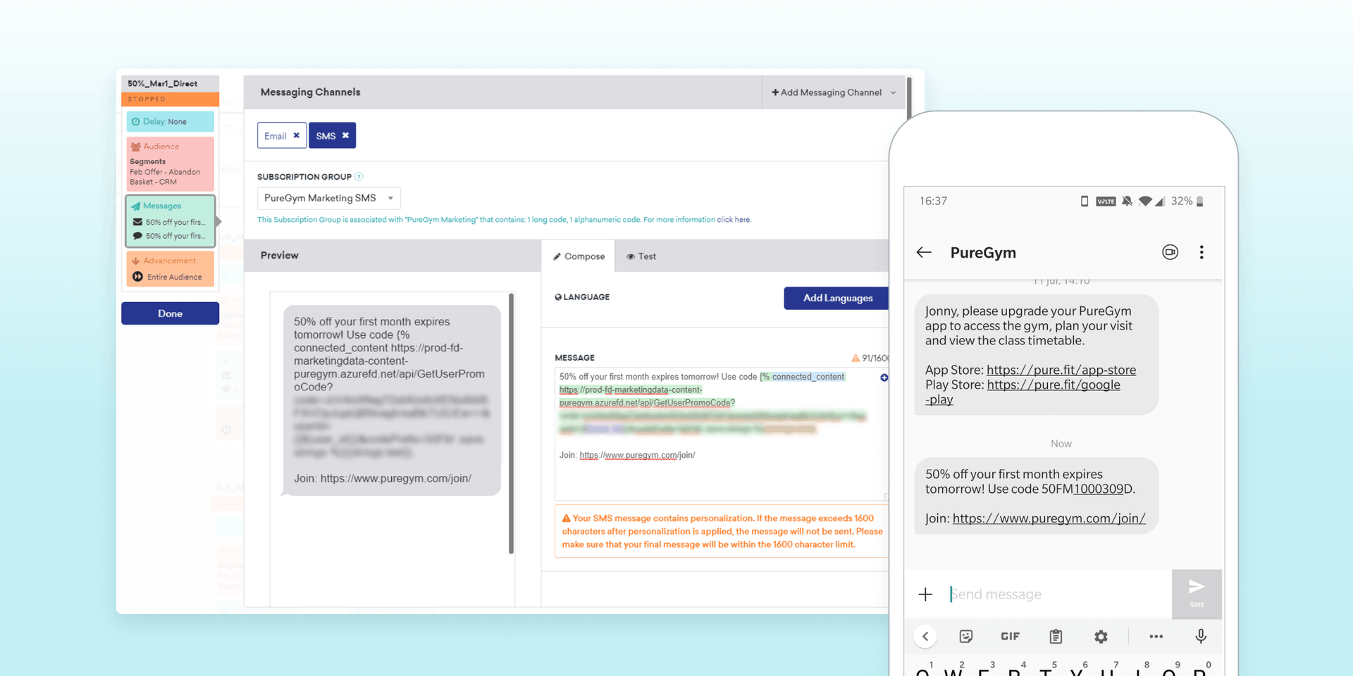 PureGym also began leveraging Braze native SMS campaigns, a channel it had avoided with its previous CRM solution because of high cost. Running a cross-channel campaign in Braze Canvas allowed PureGym to manage sending and retargeting across both messaging channels seamlessly and within a single platform.