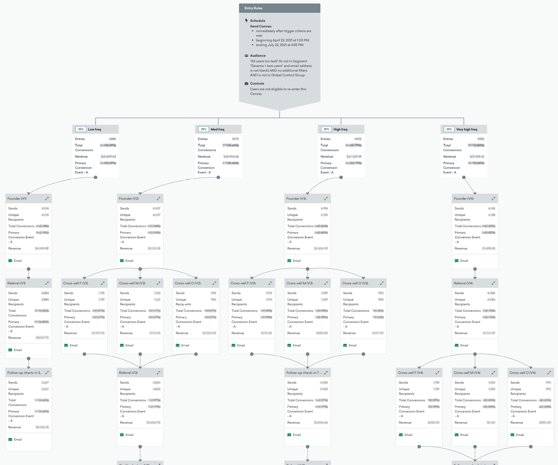 Then, using Braze, Sesame created a follow-up Canvas, which is a single unified interface where marketers can set up campaigns with multiple messaging types to form a cohesive customer journey. With their Canvas, Sesame conducted large-scale testing with four message frequency options–low, medium, high, and very high—based upon data received from Segment. Running this Canvas for a few months allowed Sesame to understand the impact of each level, what frequency level yielded the best results, and how best to utilize that information to get first-time buyers to return and make additional purchases.
