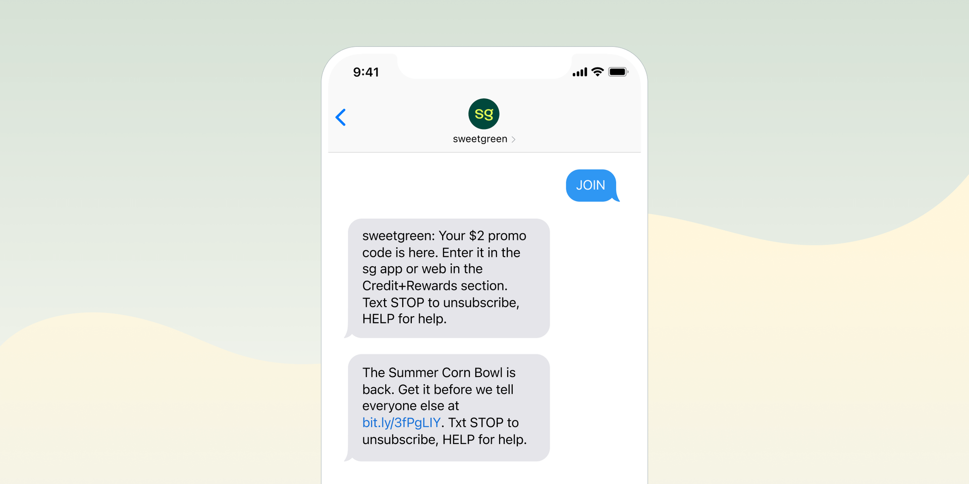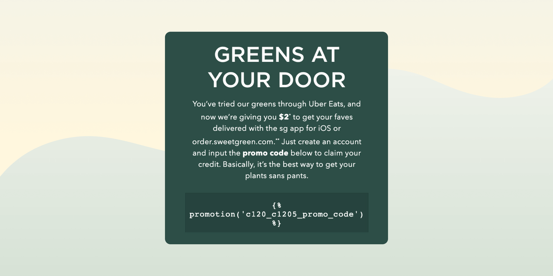 sweetgreen partnered with Braze, using our native Promotion Code feature to easily deliver order discount codes through SMS.