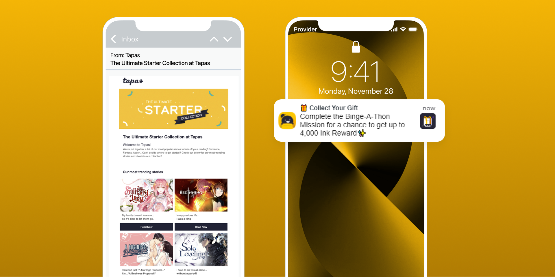 They also implemented Braze Alloys technology partner Amplitude to provide a better window into their audience’s behavior. Now Tapas identifies the percentage of users who have read some free content and purchased “Ink” to read more content within seven days. Then, using Amplitude, they calculate the average percentage of users across the titles to decide what titles to promote. This process provides valuable data surrounding what content is seeing the most success in real time, allowing them to further promote it to users who haven’t accessed it yet and increasing the likelihood of additional purchases.