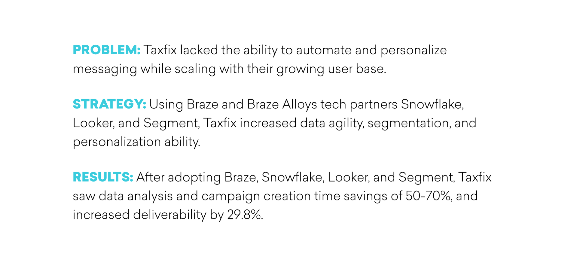 As of late 2021, Taxfix has helped collect more than €1 billion in tax returns for hundreds of thousands of users, thanks to an ever-expanding team who make filing much less complicated for their users. And with a scaleable, data-driven and deeply personalized customer engagement strategy powered by Braze and our Braze Alloys technology partners, those numbers are sure to climb even higher.