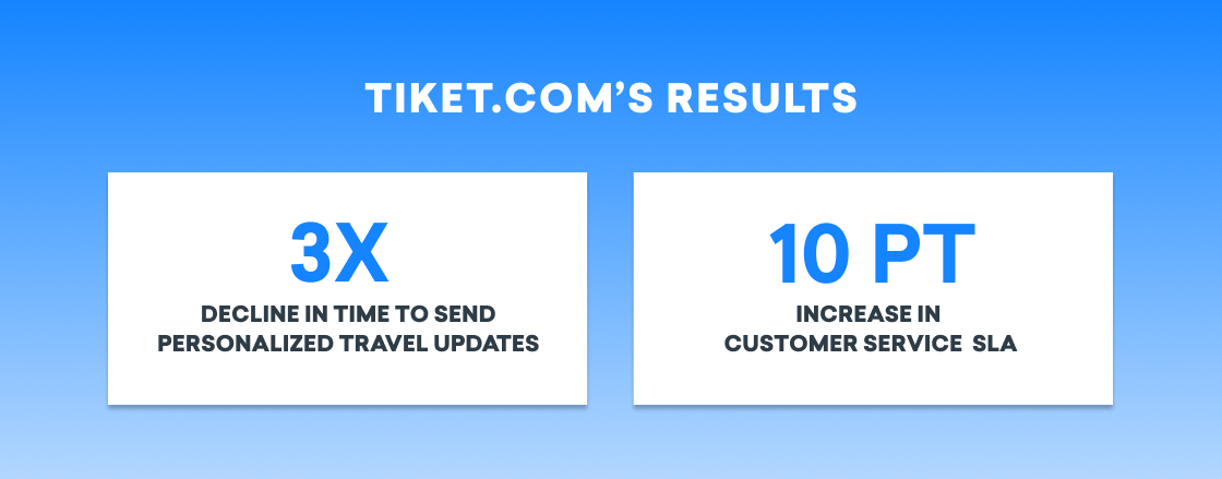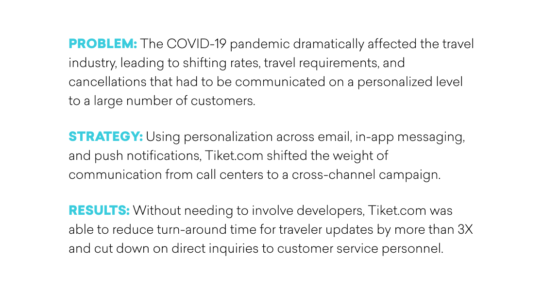 The payoff for this approach was significant. Tiket.com’s customer service SLA improved from 70% to 80% while the time it took the company to send travel updates declined by more than 3x. While personalized IAM and push notification outreach initially took three days to produce, the brand successfully reduced that time to less than a day, dramatically increasing the speed with which Tiket.com could update users on the latest information relevant to their particular trip. Best of all, these new messaging features were rolled out without the need to call on developers, allowing that team to focus on improving refund and rescheduling capabilities.