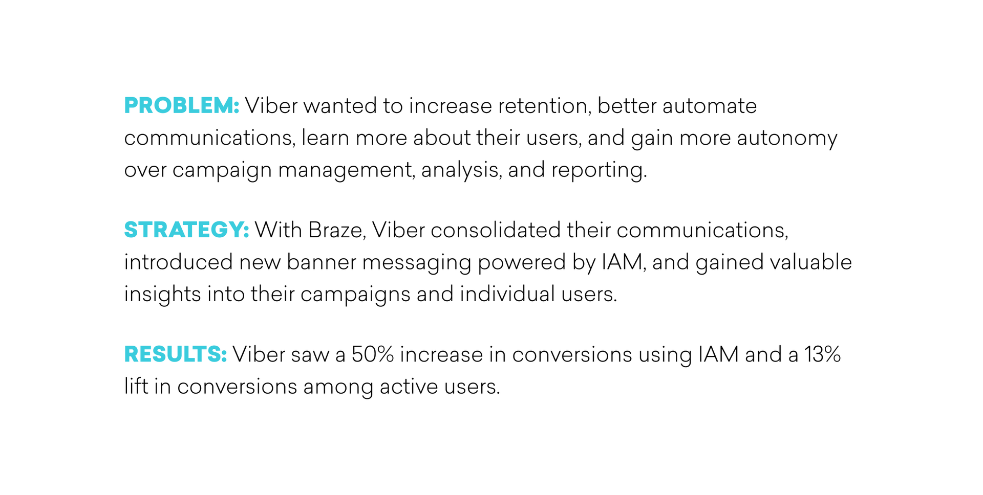 Since switching to Braze, Viber has seen up to a 13% increase in conversion among active users depending upon region. They’ve also seen a 50% rise in conversion with IAM-powered banner messaging versus their previous format.