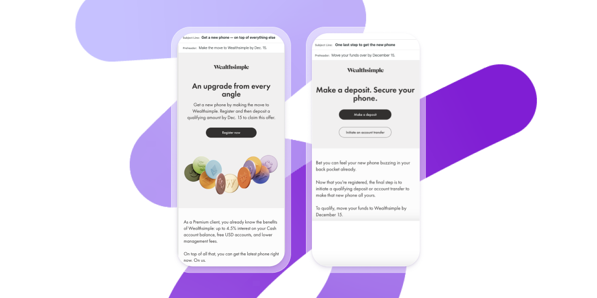 Recently, they were looking to create a campaign to strengthen new and existing client relationships by encouraging those who might be hesitant to move their assets over to take that leap. This campaign—a departure from the often complex promotions offered by traditional banks—delivered a straightforward and exciting incentive: A cell phone for clients transferring a certain amount of assets into their Wealthsimple accounts.