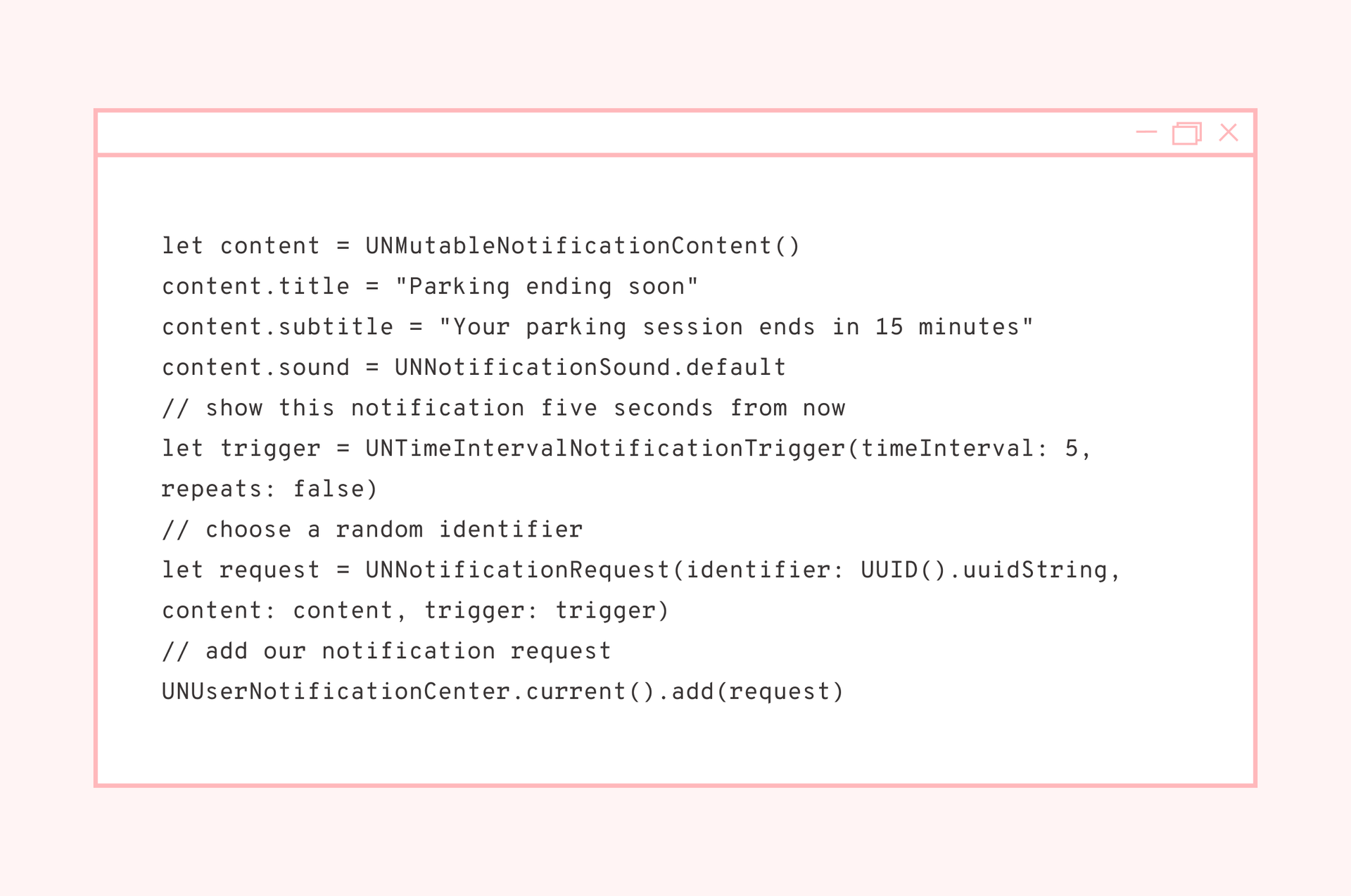 With iOS, you can use local notifications to send programmatic push notifications—without requiring any server assistance. Here's an example of how to create one: