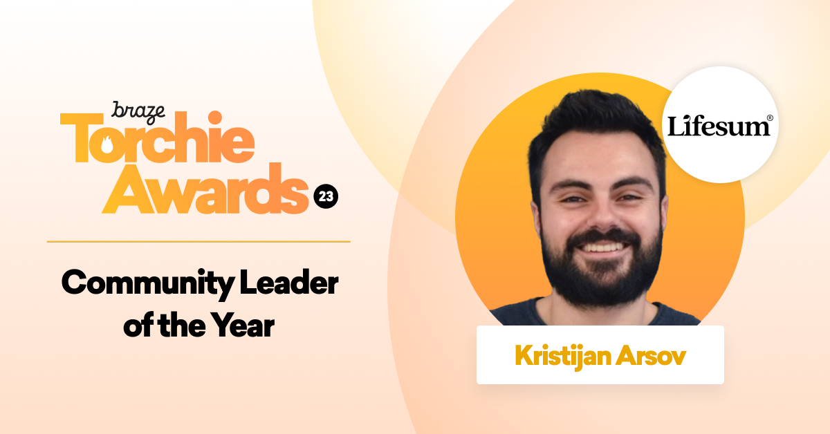 A former Bonfire Marketer of the Month, Kristijan Arsov, Lifecycle Marketing Manager for Lifesum, is a helpful and active member of the Bonfire community. We’re proud to recognize this “Bonfire Community Leader of the Year” Torchie Award winner for his consistent efforts in providing assistance to fellow members, sharing insightful use cases, and contributing valuable product feedback to the Braze team.