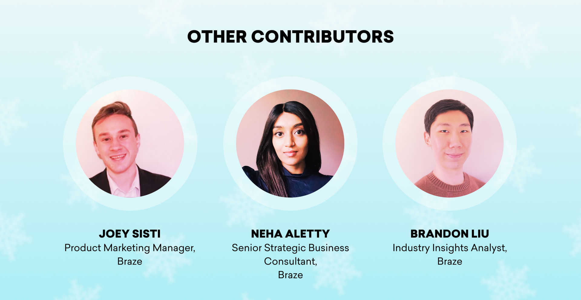 Braze pulled anonymized and aggregated data at the daily level from Braze customers in the retail and eCommerce space. These statistics span from September 2020 to February 2021. The predefined time periods for the comparative analyses are pre-holiday (9/1/20-10/31/20), during holiday (11/1/20-12/31/20), and post-holiday (1/1/21-2/28/21). The raw data has been cleaned using volume and company count checks so that no one brand or group of brands is over-represented.