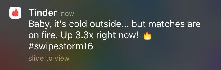 A Tinder push notification during NYC’s January 2016 snowstorm.