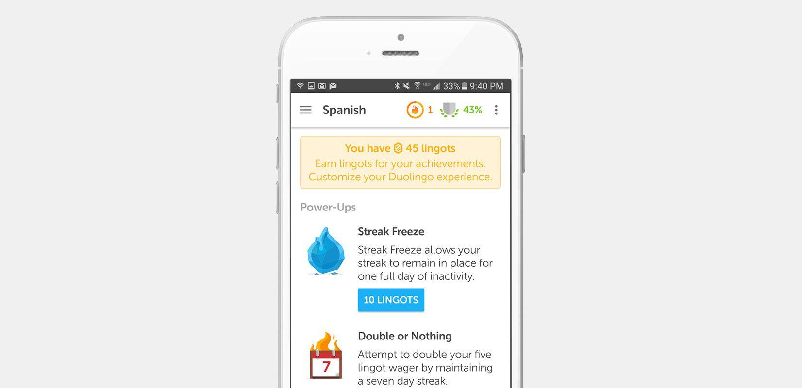 Active linguists earn “Lingots” (Duolingo “money”) by completing tests and advancing to higher levels, which can be traded for custom courses in Duolingo’s store.