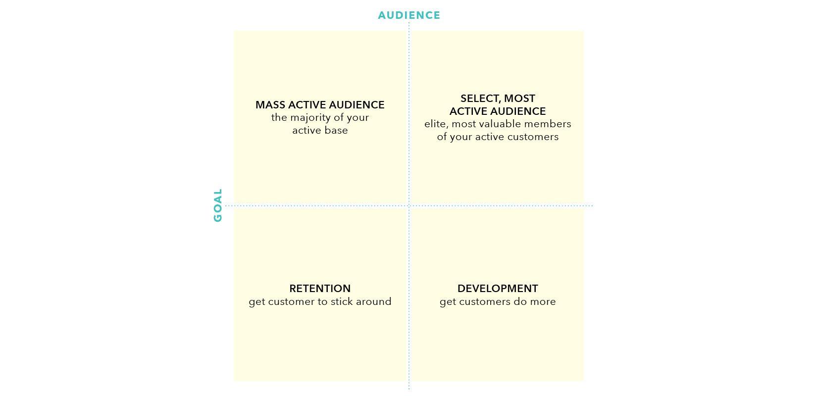 First: Who are we trying to talk to? Most of our customers are in the “mass” segment, not the most active group, says Fader. Second: Are you trying to simply lengthen the life of customers (retention) or get them to do more (development)? When you have this framework, you’ll realize there are four basic campaigns, ones aimed at the majority of active customers, trying to get them to either stick around or do more, and ones aimed at elite active audience members, trying to either retain or develop this base.