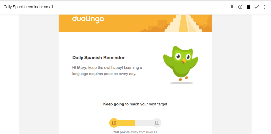 Duolingo pairs email marketing updates with push reminders to keep app users motivated to achieve their learning goals.