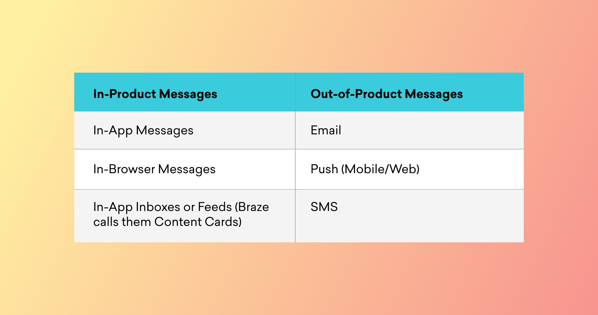 Whether you're looking to brainstorm new campaign ideas or uplevel your current campaigns, check out our Braze Inspiration Guide, packed with 40+ ideas designed to maximize customer activation, monetization, and retention across email, SMS/MMS, mobile push, in-app messages, content cards, web push, in-browser messages, social media, and ads.
