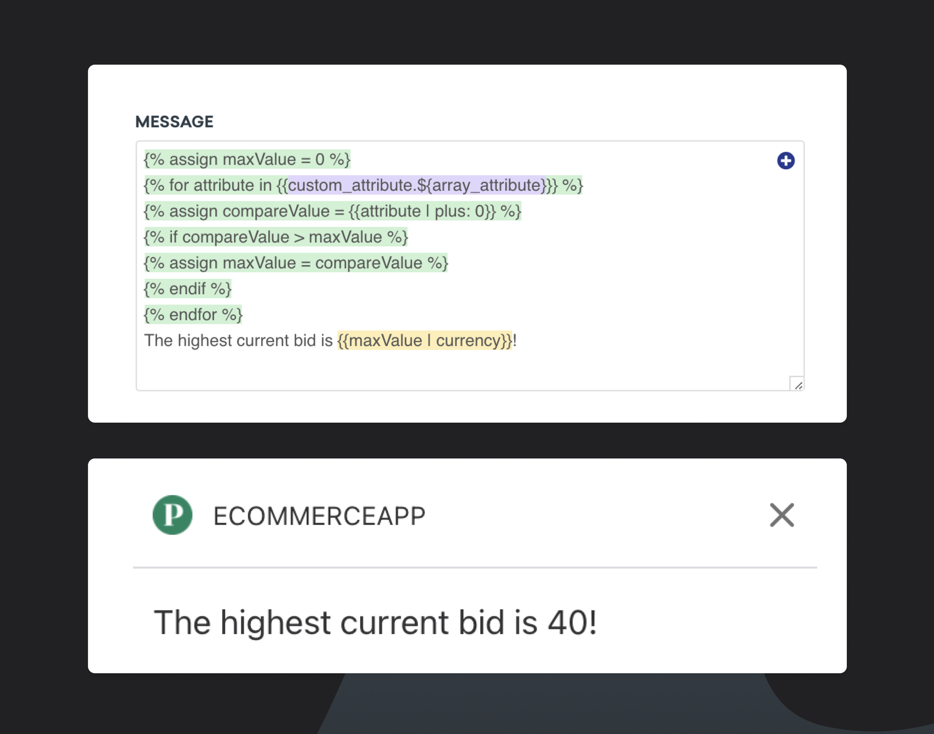 Using the Liquid logic “maxValue,” you can automatically showcase items that are the highest value from a list of values, such as the high scores within your gaming app or the highest bids on an item for sale in your company's bidding marketplace.