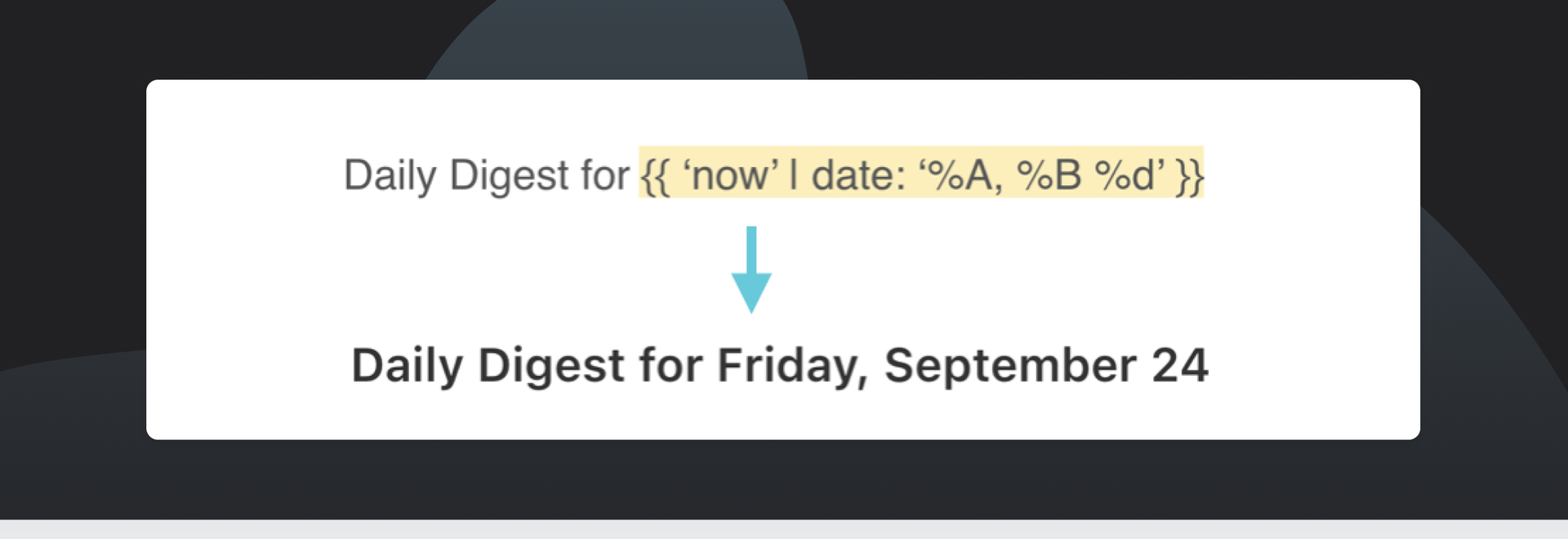 Use the Liquid variable 'now' in conjunction with the date filters ‘%A, %B %d’ wherever you'd like the message’s send date to show up. By adding the code: {{ ‘now’ | date: ‘%A, %B %d’ }}, the send date will appear (for example: Friday, October 15) and will be personalized to the specific send time of each individual recipient, on a per-user basis.