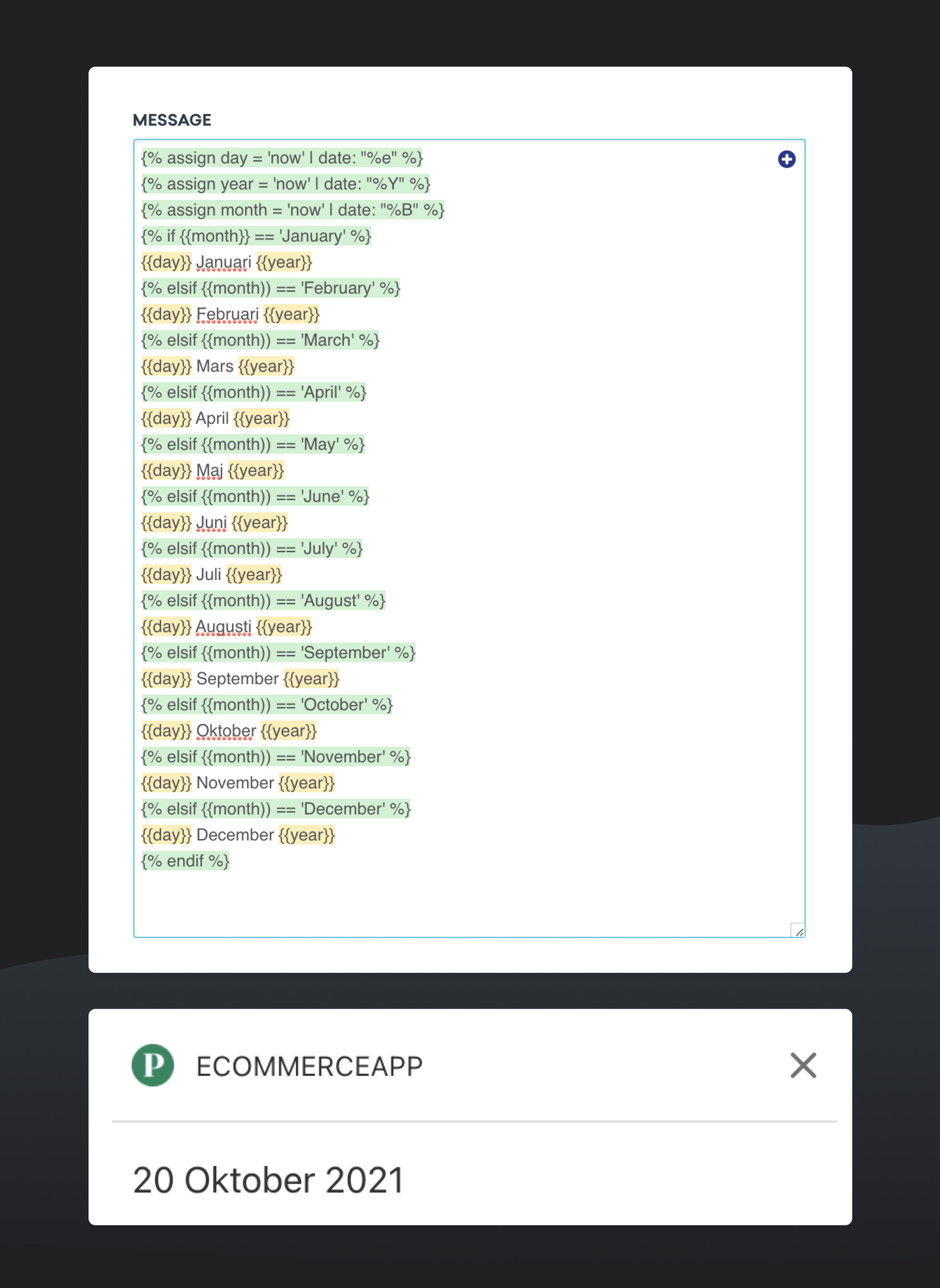 If language-based personalization is critical to your brand's customer engagement strategy, you can take tip #1 a step further by customizing the language that the date is displayed in. For instance, if you want to display the date in Swedish, you could include the following Liquid code: