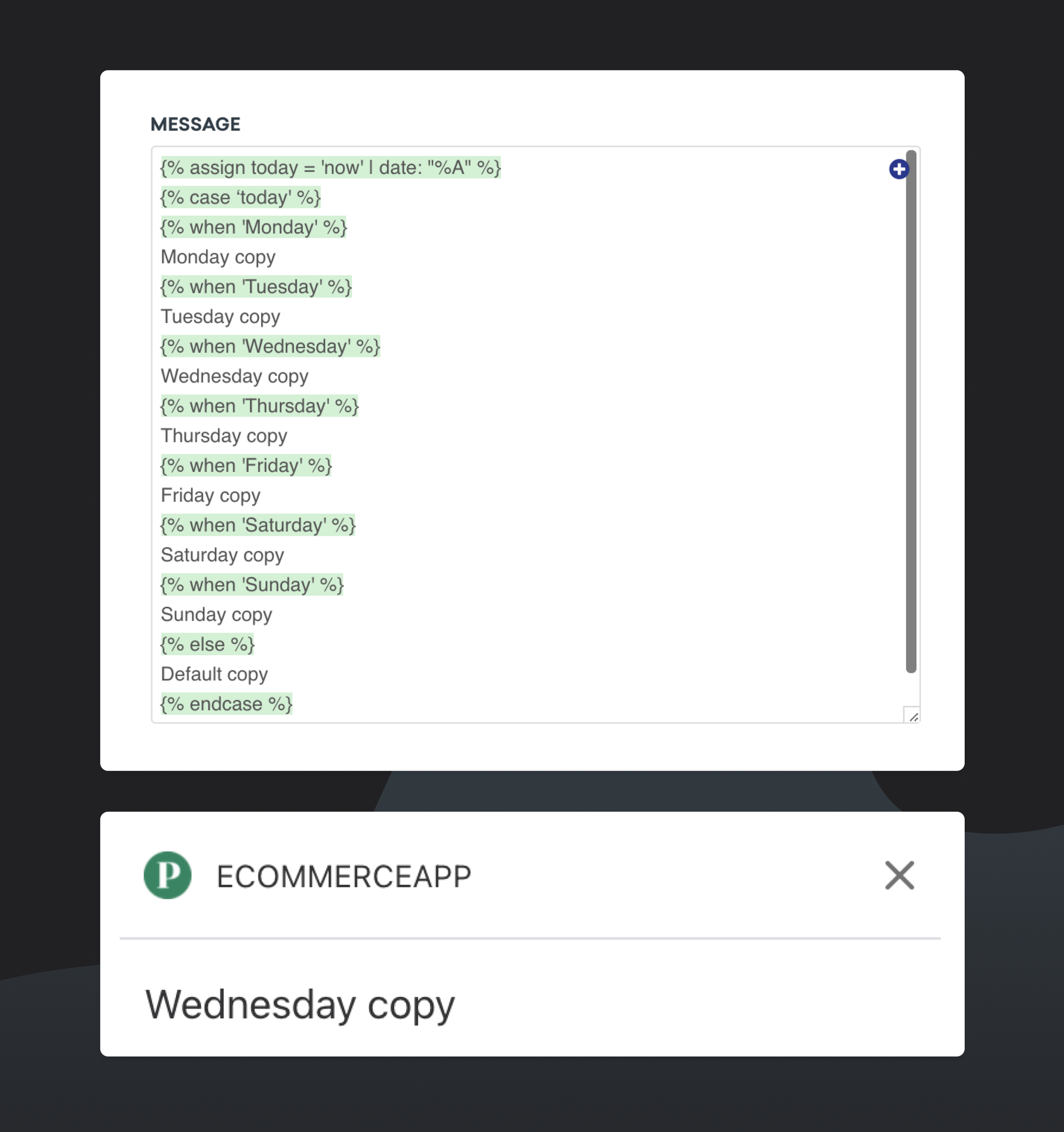 Note: You can also replace the line “default copy” with {% abort_message() %} to prevent the message from being sent if the day of the week is unknown.