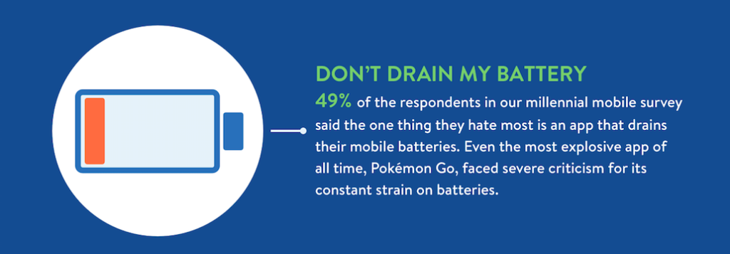 One of the biggest mobile app pet peeves amongst millennials is the drain on their phones’ batteries. As technology has evolved over the years, we’ve enjoyed the luxury of increasingly better graphics and mobile experiences. Unfortunately, many of these features come at the cost of a significant drain on battery life.