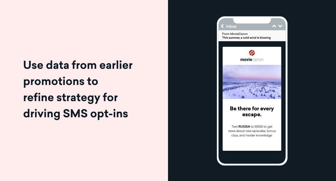 Once your promotional efforts have led to some sign-ups, it’s time to use the data you’ve collected on what channels have led to the most opt-ins to optimize your acquisition efforts. If, for instance, you’re finding that email is having more success in persuading current customers to opt in for SMS, you can leverage this channel to send more targeted promotional messages that leverage their knowledge of your brand.