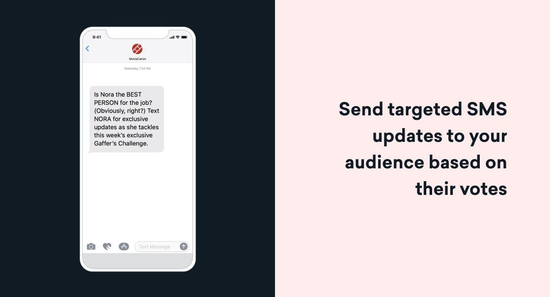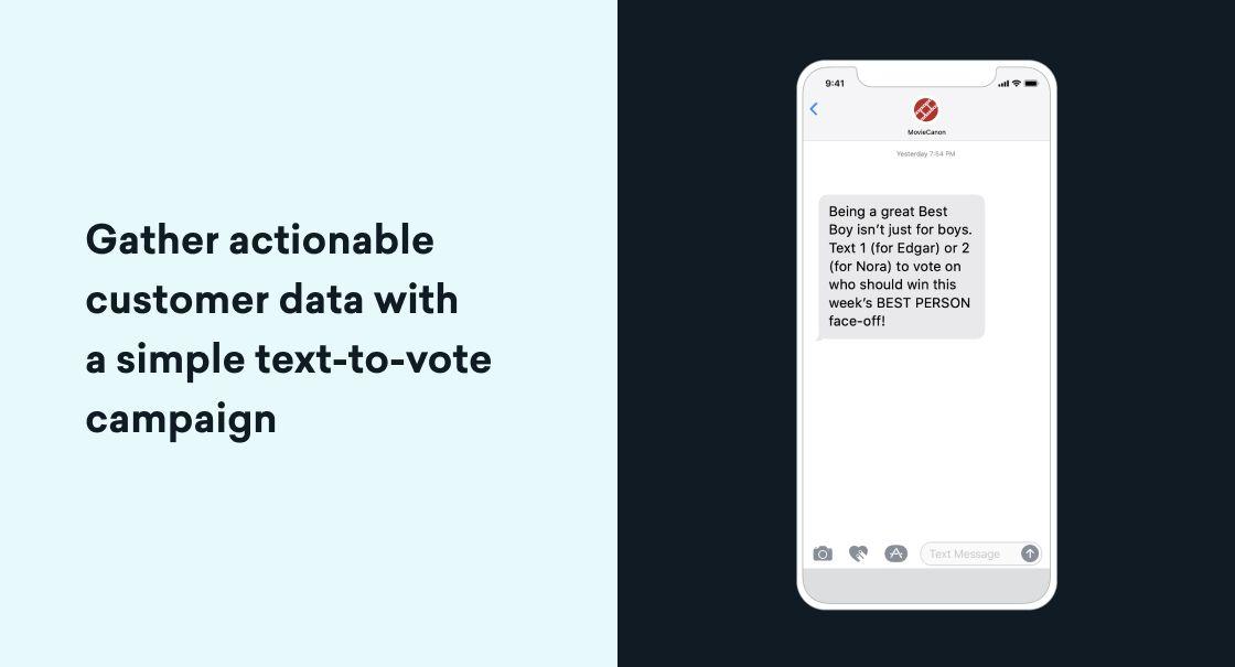 While this approach is most associated with media and streaming brands, creating a text-to-vote poll can work across a variety of verticals by making the act of sharing their interests or preferences feel empowering to users. You could pit different products or services against each other and then use individual recipients’ results to adjust the SMS messages you send them going forward.