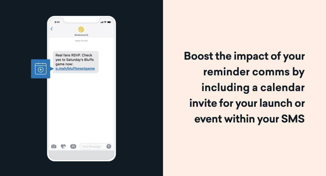 For brands looking to drive people to time-sensitive sales, events, or content, it’s possible to enrich the targeted SMS you send using an integration with digital calendar solutions. That way, instead of sending a customer four SMS messages about an upcoming event, you can send a single text message and that customer will receive calendar reminders designed to get them to attend.