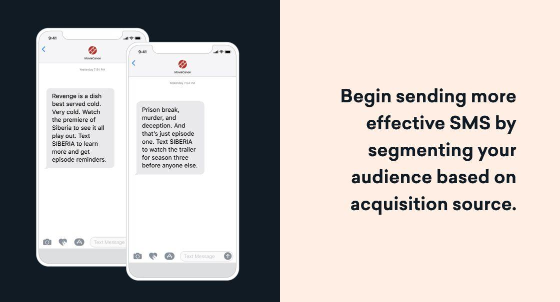 As your SMS sign-up efforts lead to a larger audience of opted-in customers, you may find that there’s an opportunity to start sending SMS campaigns that draw on the specifics of the different acquisition campaigns you ran. For instance, if your OOH campaign used noticeably different creative than your email campaign, you could segment your SMS audience by acquisition channel and tweak copy to ensure that there’s continuity between the messaging that pulled them in and the messages you’re sending them.