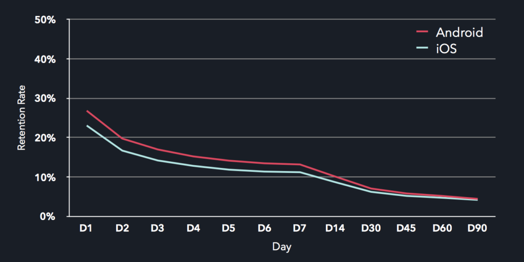 You can see an example of this difference in the social and messaging vertical. While Android apps tend to have stronger retention than iOS apps, social and messaging apps on iOS consistently outperform their Android equivalents throughout the 90 days following first use and have the highest retention rate of any vertical after three months.