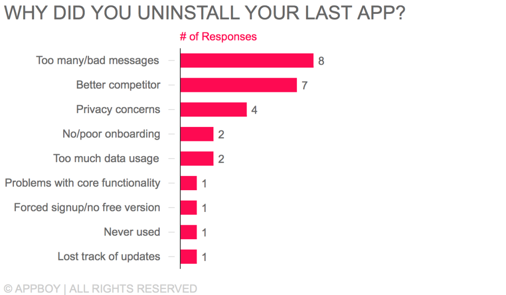 We talked to 22 employees here at Appboy about the last app they uninstalled: how long they used it, what prompted them to disengage, and whether there’s anything that those brands could do to win them back. We heard stories that speak to huge pitfalls in the app/user relationship, ones that you might recognize as an app consumer, as a marketer, or both. While this small sample size—22 people who work in the mobile app business and live in either New York or San Francisco—is pretty unscientific from a stats perspective, these stories are very illuminating as anecdotes. Let’s take a look.