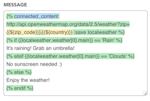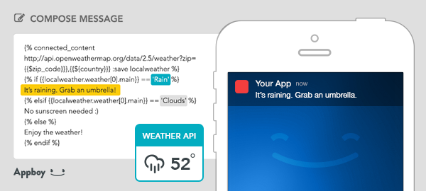Appboy Connected Content allows marketers to automatically insert a wide array of information – everything from up-to-the-minute sports scores and nearby movie showtimes to weather advice and customized product recommendations – directly into the messages they send users.