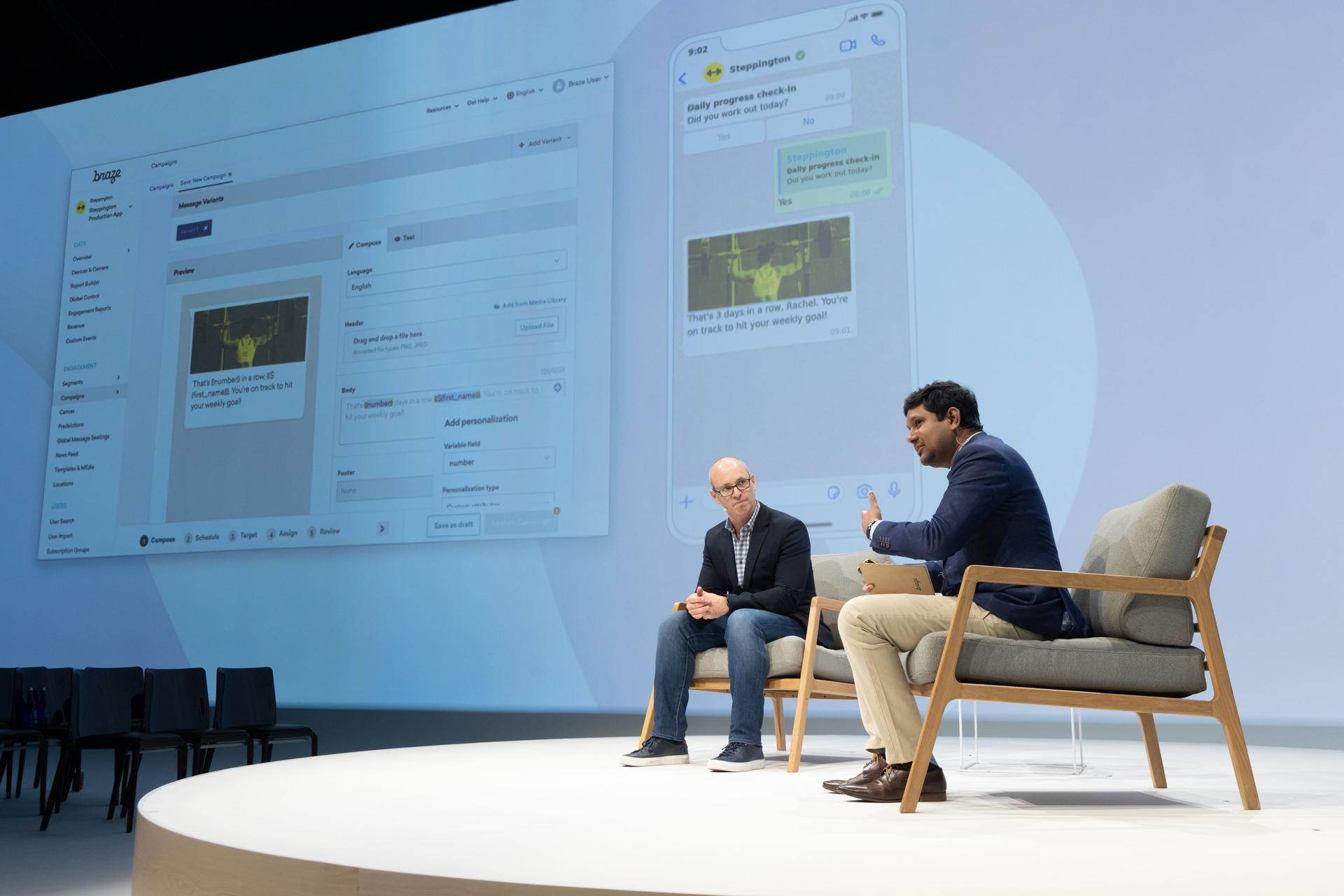 Meta’s Craig Goodfriend (left) and Braze Head Evangelist Magith Noohukhan (right) discuss the Braze platform’s native support for WhatsApp messaging