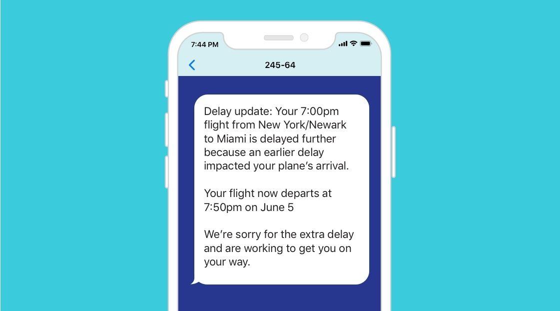Then about a month later, I had a very similar (and similarly frustrating) experience with the same airline. I’d booked a flight back to Newark Airport from Miami when I received an SMS from the airline letting me know that my 7:00 p.m. flight was delayed would now depart at 7:50 p.m. That’s really useful information and exactly the kind of message that airlines should be sending to their customers—or it would have been if it weren’t already 7:44 p.m. when it was delivered. After all, if the flight really were going to depart at 7:50 p.m., it would have been pretty obvious to the recipient (me) because we would have been on the runway.
