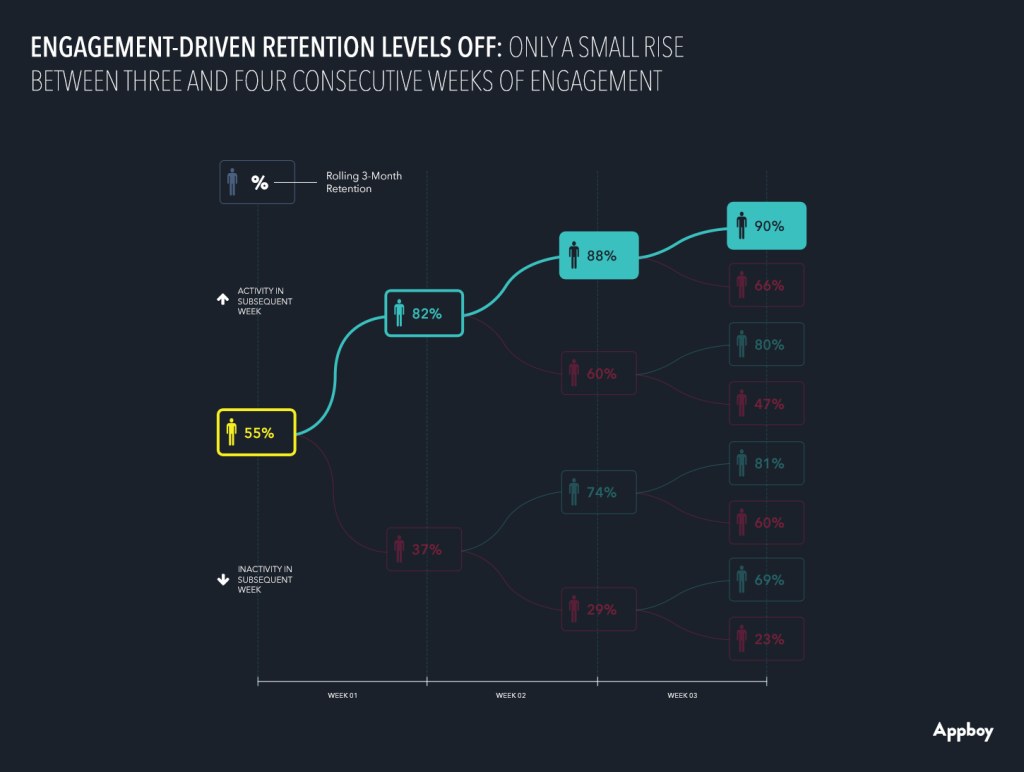 Rituals support healthy relationships. Whether or not you regularly make the time to have coffee with a friend will affect if you stay close over time. And that same principle holds true when it comes to relationships with your customers. New research carried out by Appboy* (that’s us!) has found that levels of customer engagement have a direct correlation with levels of customer retention. More specifically: