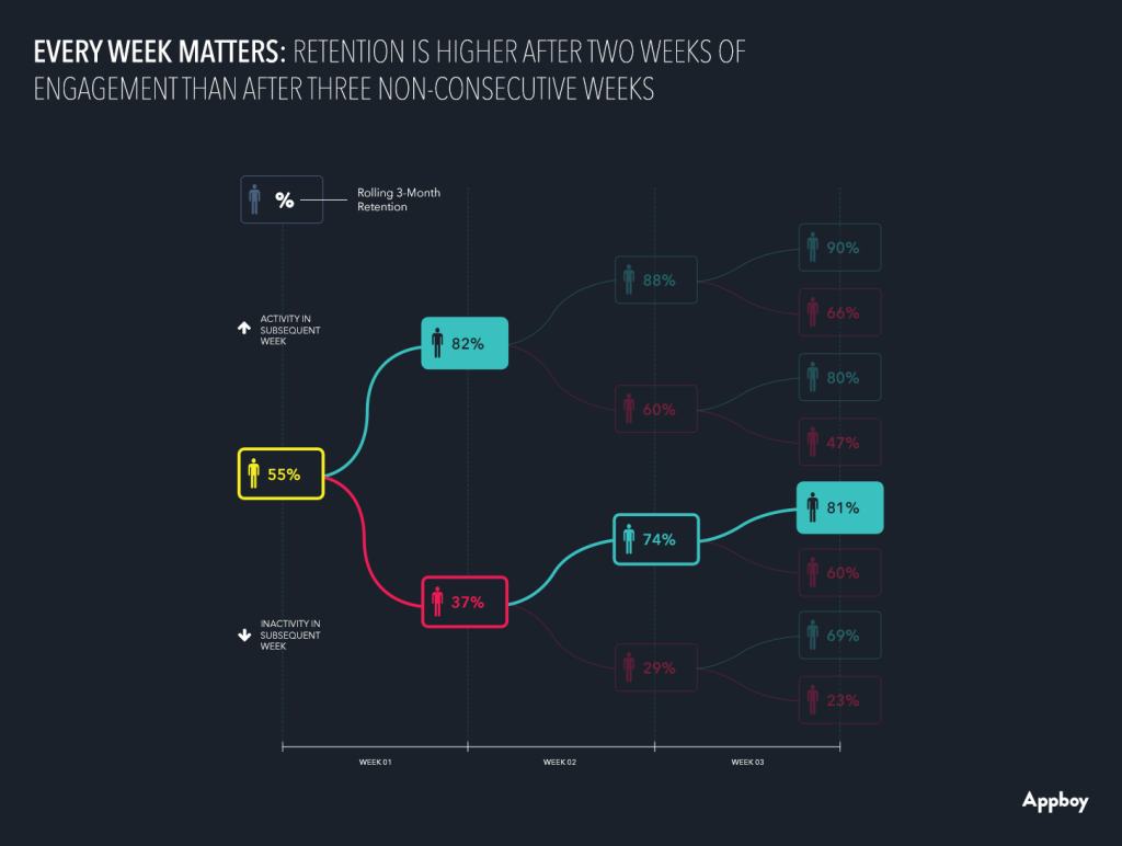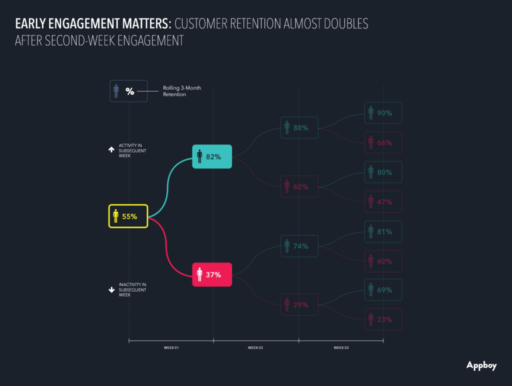 Customers who engage with an app during week two have a retention rate of 82%. But customers who don’t engage during week two need to engage during both week three and four to get their retention rate up to 81%.