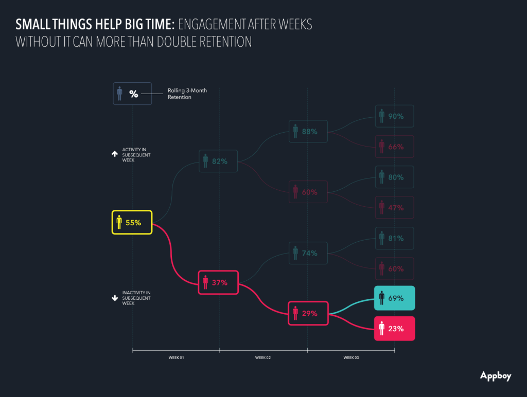When it comes to retention, consistent customer engagement has a major impact that grows over time. That means that new customers who engage with an app week after week for the first month after download have the highest levels of retention, with 90% of them showing additional activity over the next three months. On the other hand, lack of engagement builds the same way, too: only 23% of customers who fail to engage with an app during weeks two through four will be retained.