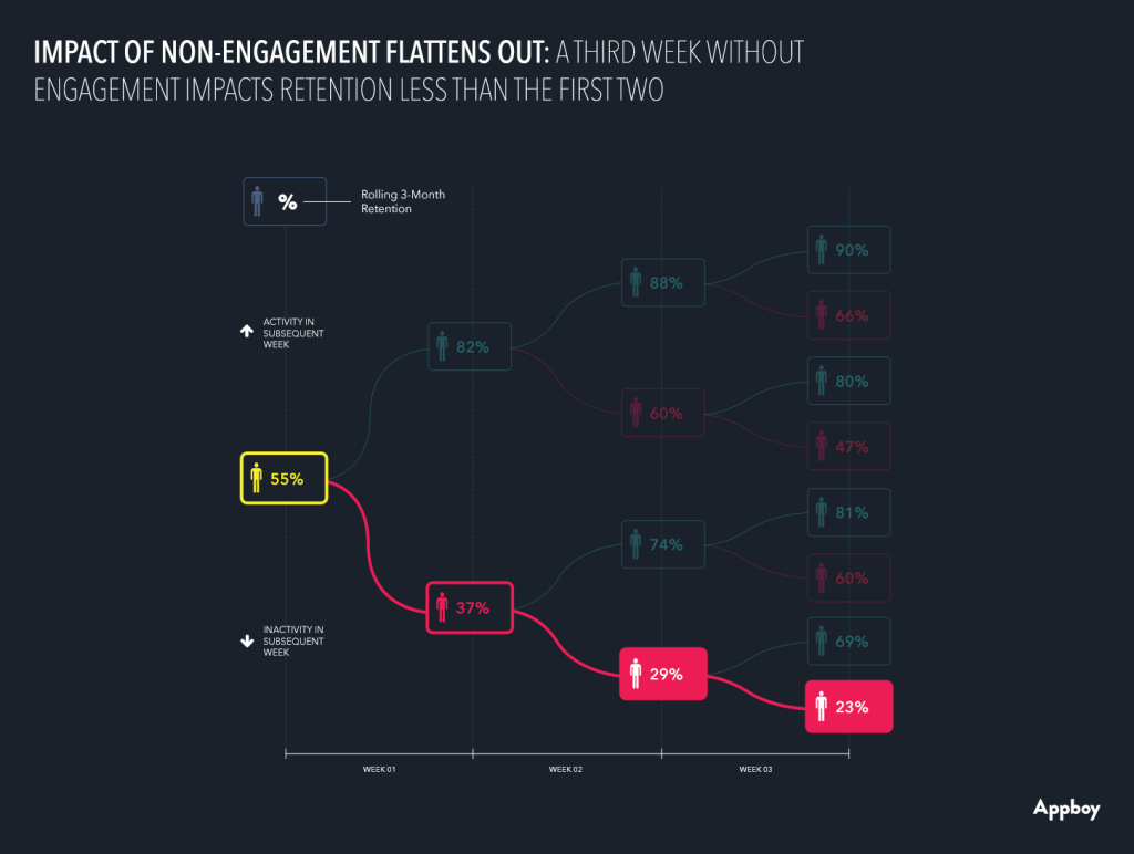 The negative impact that lack of customer of engagement has on retention levels off, too. While 29% of customers who don’t engage with an app in weeks two and three are retained, a third consecutive week without engagement only drops their retention rate to 23%.