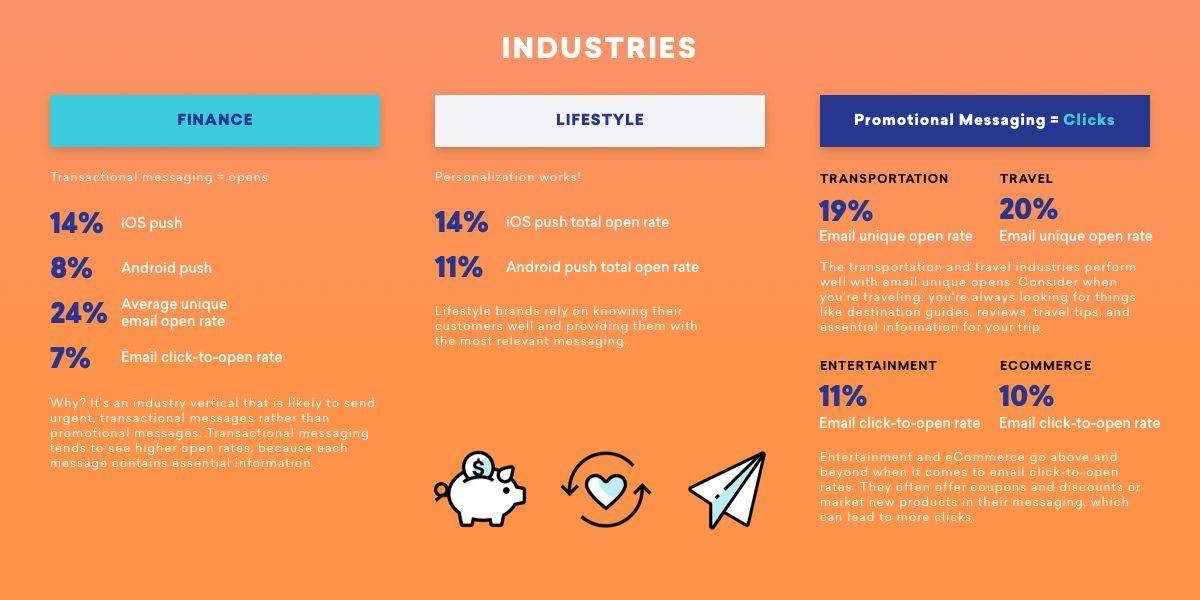 For any of you out there who have followed us since the Appboy days, our new Benchmarks tool is an updated version of our 2016 Digits Report, back—and better than ever!—by popular demand. This interactive report allows you to see metrics by channel (push, email), by operating system (iOS, Android, and web, where appropriate), and includes a breakdown of data by industry in the full experience.