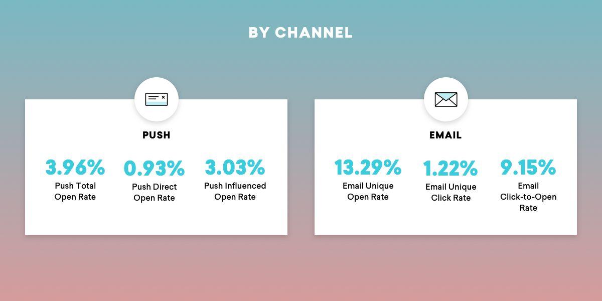 Let’s say your direct push rates on a campaign are a lot higher than your influenced push rates. That’s great! Your messages are encouraging people to engage in the moment. Take the momentum, and start optimizing to get your direct open rates even higher. Maybe your team decides to test the same copy, but to use some rich content like an image, GIF, or push action buttons to encourage people to continue interacting directly with the notification. On the other hand, let’s say you put out a push about a weekend sale and your influenced push rates are a lot higher than what the Benchmark data shows. First off, good on you for sending out a message that was engaging enough for users to think to go back to your app or site on their own. Use this success as data to back similar campaigns in the future, and maybe test sending some reminder pushes or cross-channel messages (like an email follow-up) to see if your rates improve even more when you give your users a little extra nudge. After all, Braze data tells us that engagement rates increase as much as 642% when you combine two or more channels.