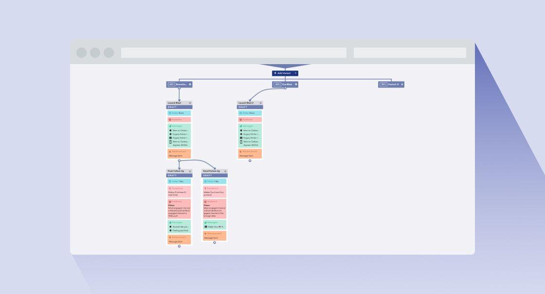 - Once you know that, it’s super easy to build out this sort of test in Canvas. In the example above, we created the variant on the left then cloned it and deleted the two follow-up steps. We could have also cloned the original variant, then changed the copy or decreased the delays in the follow-up steps from one day to one hour, for instance.
