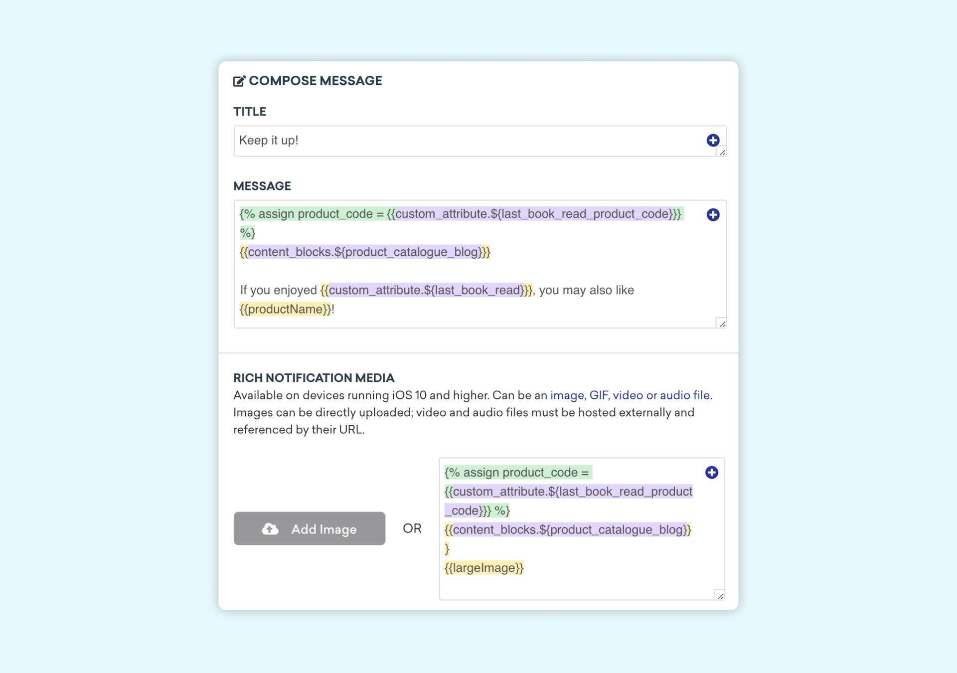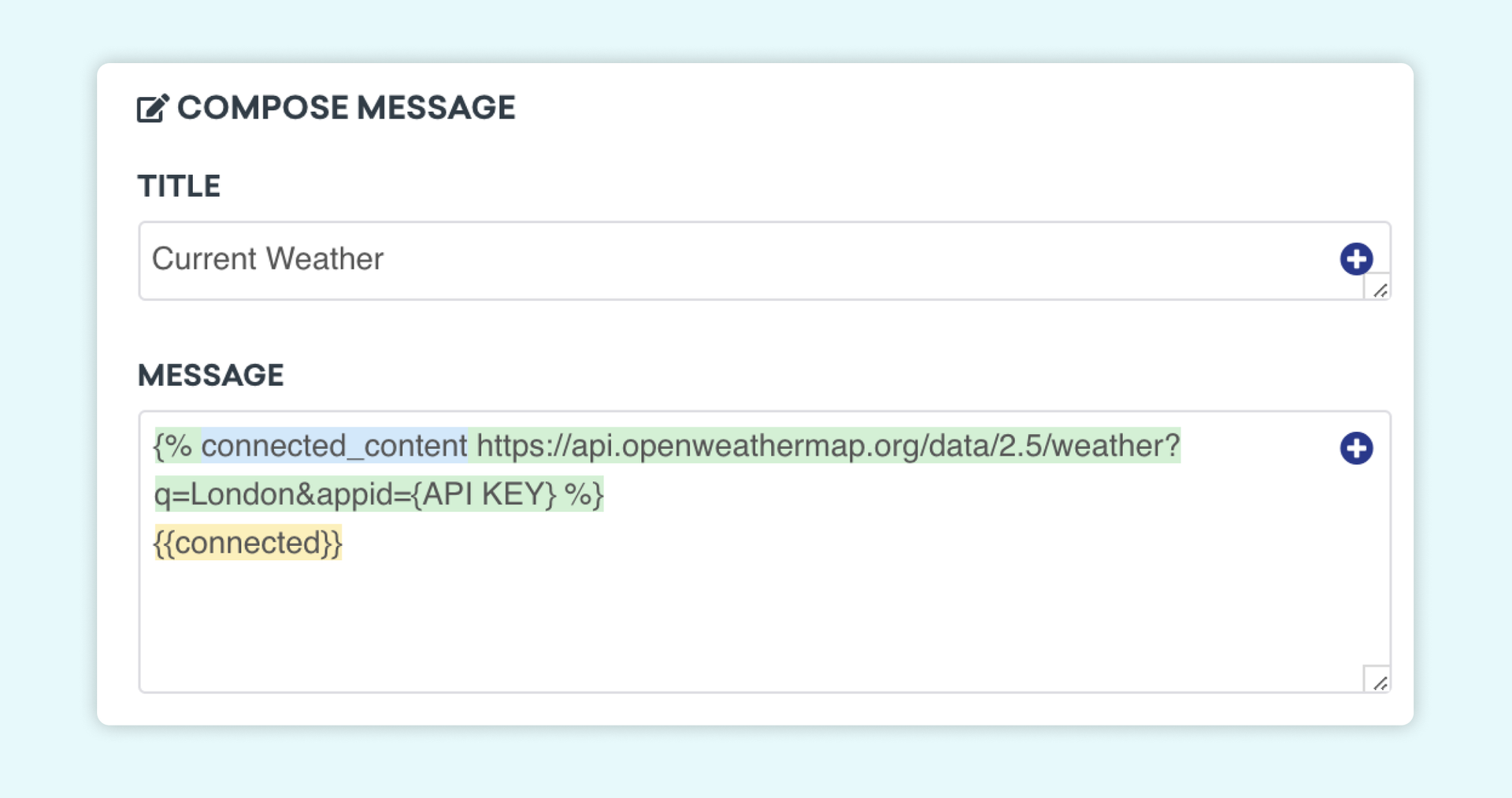 Connected Content can be used across all of the different messaging channels supported by Braze. To leverage this tool in connection with a given message, all you need to do is insert the {% connected_content %} Liquid tag within the campaign composer in the Braze dashboard. The basic syntax of the request is as follows: