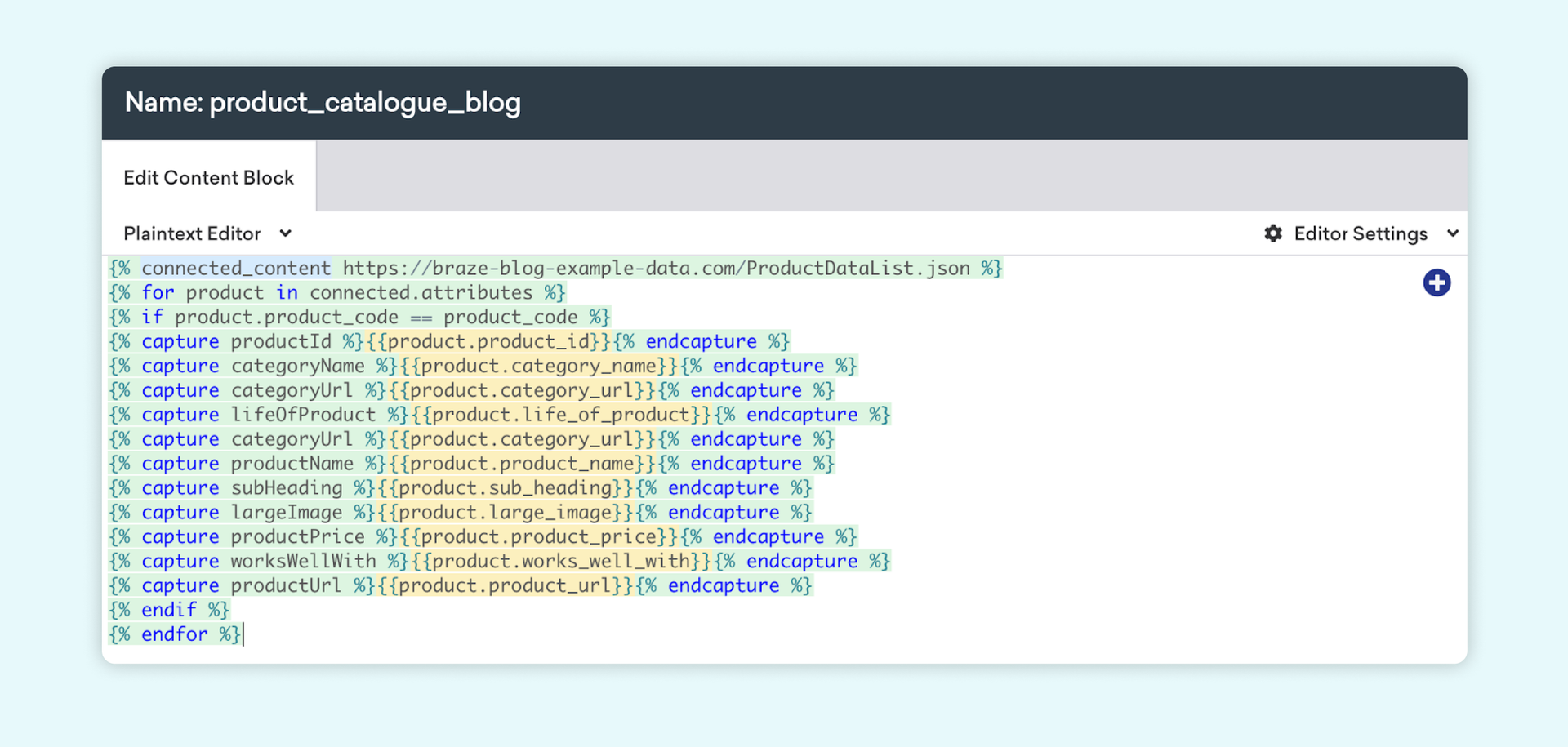 You’d start by creating a Content Block within the Braze dashboard, then adding Liquid to make the Connected Content request, properly parse the payload, and save the relevant properties down to individual Liquid variables. These variables can then be used later in the campaign.
