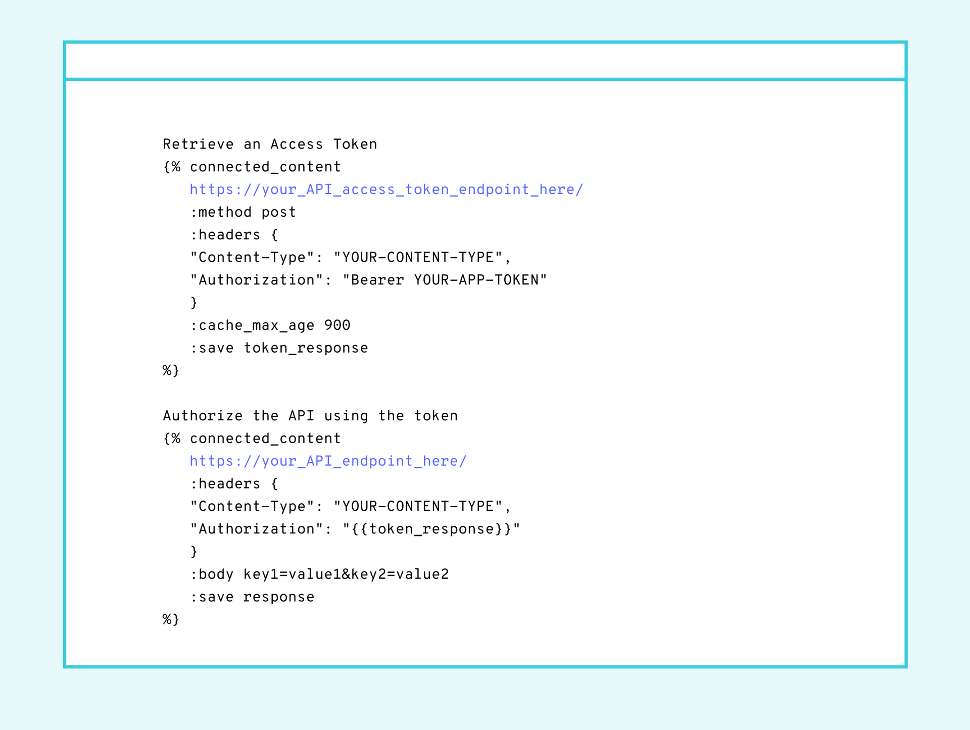 In addition, Braze now supports the ability to include dynamic Liquid variables within both the headers and the body of a Connected Content tag, making it possible for the response from one Connected Content call to be used in a subsequent call. This opens the door both for Open Authentication and for advanced use cases where the response of the initial Connected Content call is required for the next Connected Content call.